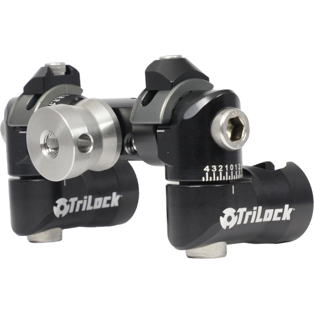 Adjustable v-bar mount with eyebolt offers micro-adjustments to angle the back bars up and down or side to side for proper stabilizer/v-bar balance. Attaches to front riser or v-bar extensions. TriLock features three raised boss taper surfaces on the male connector for a stronger connection. An added second lock from the AnchorGrip that adds biting teeth with easy angular adjustability. Includes two side rod Centerlok quick disconnects that allow you to add and remove your stabilizer quickly for transport and easy storage. Internal nut mounts flush with the quick disconnect. Laser engraved indicator lines for precise micro-adjustments. Includes 5/16”-24 stainless steel hardware. Ambidextrous for RH/LH use. Stainless steel eye bolt included for v-bar extension attachment and CNC machined.