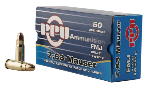 PPU PPH763 Handgun 7.63mm Mauser 85 GR Full Metal Jacket 50 Bx/ 10 Cs- Handgun- 7.63mm Mauser- Full Metal Jacket- 85 GR- 430 ft lbs-...