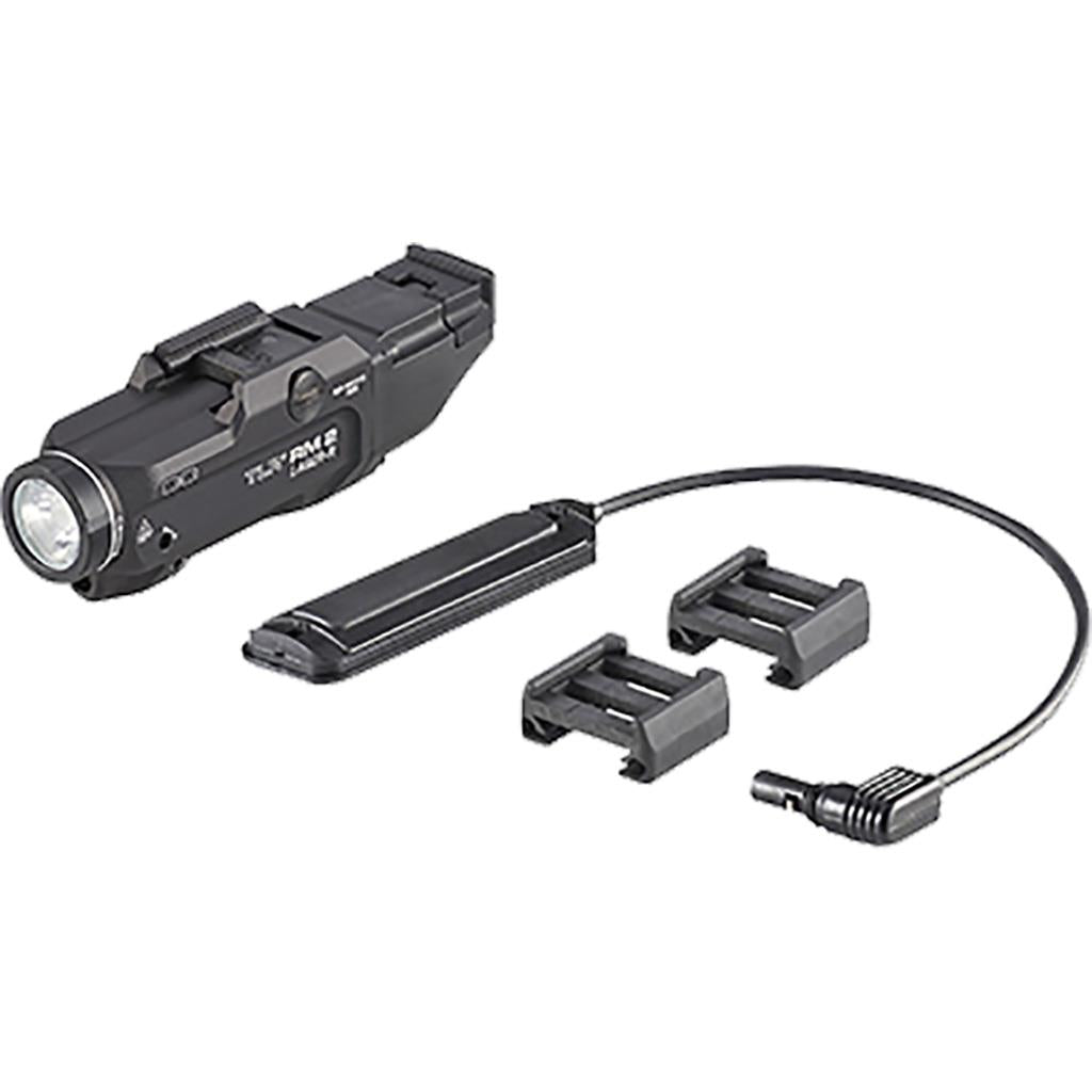 The TLR RM 2 Laser features independently operating push-button and remote pressure switches. Continued pressure on the pressure switch provides momentary-on activation, a tap of the switch puts the light in constant-on mode. A mode selector toggle switch transitions from laser only, light only, or light/laser combo modes. This light securely attaches to long guns with MIL-STD 1913/ Picatinny rails. Packaged as a complete package, this model includes a remote pressure switch and key kit. The TLR RM 2 is powered by one CR123A battery and is IPX4 water-resistant.