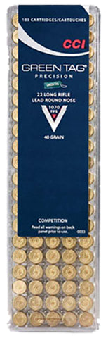 Manufacturer: CCI/Speer Caliber: 22LR Bullet Type: Lead Round Nose Bullet Weight: 40 Grain Model: Competition Green Tag Rounds Per Box: 100 Boxes Per Case: 50...