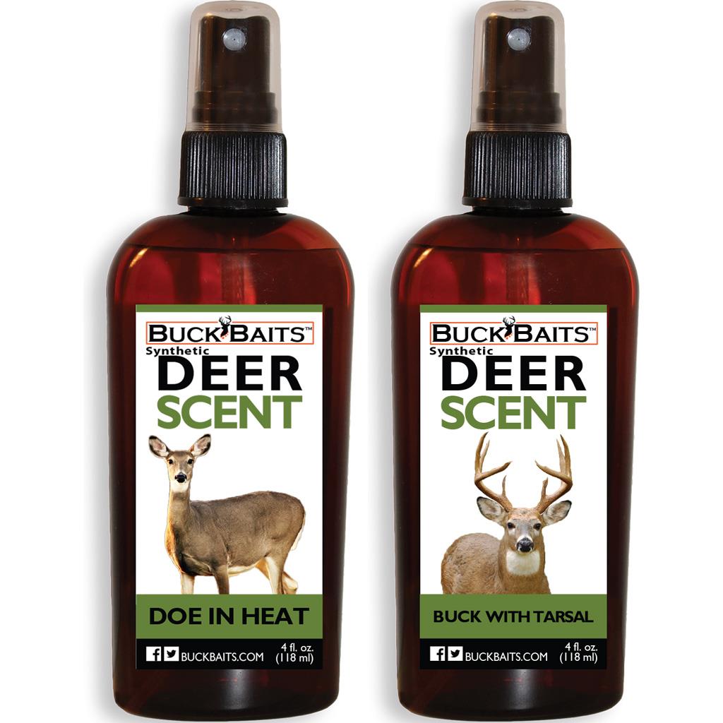 Synthetic Value Pack include Buck Baits synthetic Doe In Heat urine scent lure will get the attention of the big bucks in your area and brings them into your desired shooting range. Perfectly replicated formula with effective results when natural urine is not an option. Can but used throughout the season but most effective during the whitetail pre-rut and rut season. Also included is Buck Baits synthetic Buck With Tarsal urine scent lure is used to lure big dominate bucks. Perfectly replicated formula with effective results when natural urine is not an option. Effective early season, pre-rut and during rut. Also used to create scent trails or mock scrapes. Potent and highly effective natural smelling deer urine scents. This product is not made from any cervid animals or biologics. Value Pack Includes: 1 - 4 oz. Doe In Heat Scent, 1 - 4 oz Buck With Tarsal.